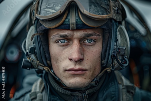 pilot, aeroplane, cockpit, helmet, goggles, aviation, flight, aircraft, professional, transportation, air, force, military, flying, portrait, man, young, caucasian, blue, eye, serious, determined, confident, skill, life events, instrument, uniform, adventure, travel, danger, hero, fighter, jet, air show