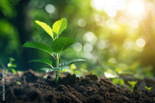 Young plant growing on nature view with sunlight background. Growing sustainability concept. Eco friendly. Limit climate change and global warming. Ecology, ecological balance, and ecosystem concept