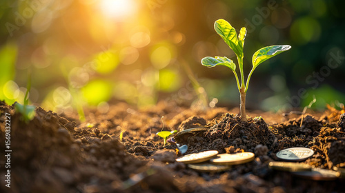 Young plant sprouting in coins, sunlit garden soil with warm backlight, soft golden sunlight from behind, close-up with shallow depth, growth and finance symbolism