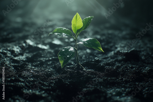 Young plant thriving in sunlight after rain