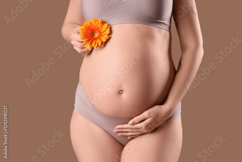 Young pregnant woman in underwear with gerbera flower on brown background, closeup