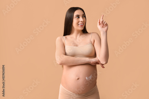 Young pregnant woman with cream against stretch marks on her belly pointing at something against beige background