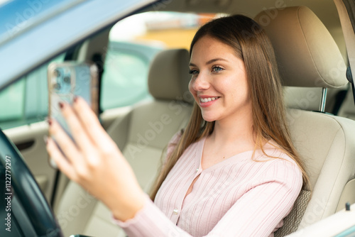 Young pretty blonde woman inside a car