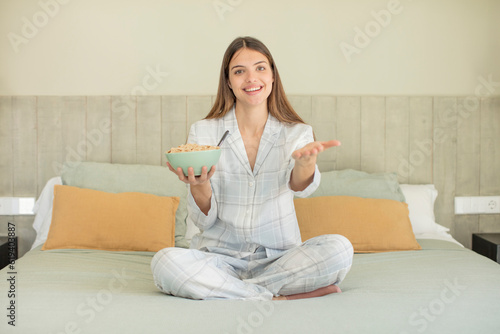 young pretty woman smiling happily and offering or showing a concept. breakfast concept