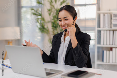Young smiling Female call center operator doing his job with a headset.Portrait of call center worker at office.