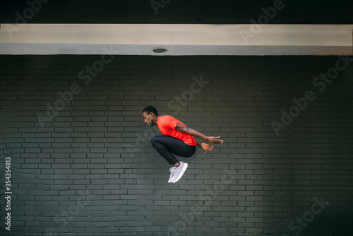 young, sportive, man, jumping, brick, wall, copy space, 1, people, sport, adult, exercising, grey, red, fit, fitness, training, recreational, exercise, athlete, jump, achievement, energy, leisure, strength, modern, motivation, motion, exterior, building, outdoors, hobby, jogger, mid-air, runner, activity, ambition, crouched, jersey, vitality, agility, healthy, lifestyle, physical exercise, recreation, facades, good, shape, active, male