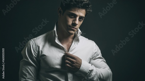Young Stylish Man in White Dress Shirt Looking Thoughtful Dark Background.