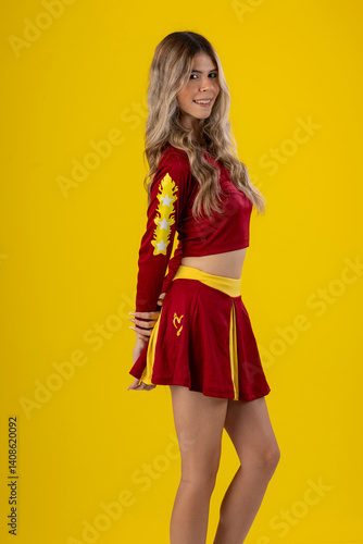 cheerleader, girl, teenage, victory, fun, team, sport, young, woman, athlete, american, caucasian, white, high school, university, college, school, happiness, cheerful, person, model, studio, full body, pom-pom, cinematic
