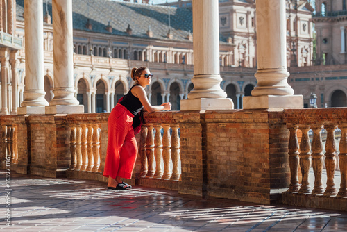 Young tourist female in sexy sunglasses enjoying Plaza de España Square with galleries lited up with evening sunlight making magic shadows. Spain Square, Seville , Andalusia, South Spain.