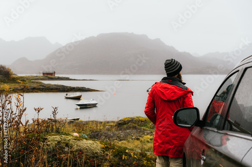 admire, alone, automobile, backview, beard, blurred background, boat, breathtaking, calm, car, cloudy, explore, explorer, fog, guy, harmony, hat, holiday, journey, landscape, male, man, mist, mountain, nature, norge, outdoors, overcast, parked, picturesque, raincoat, range, ridge, road trip, scenery, scenic, sea, serene, sky, spectacular, tour tourism, transport, travel, traveler, trip, unrecognizable, vacation, wanderlust, young
