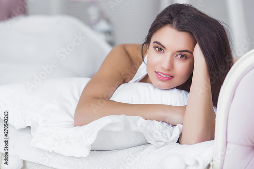 woman, sleep, awake, morning, night, bed, bedchamber, home, pillow, sheet, white, caucasian, fresh, freshness, casual attire, cosy, cosiness, brunette, hair, relax, rest, female, girl, lady, adult, smile, cheerful, sexy, beauty, skin, care, health, health care, copy space, free space, body, wake up, dream, early, gorgeous, lay, model, joyful, lazy, lifestyle, leisure