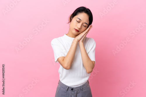 Young Vietnamese woman isolated on pink background making sleep gesture in dorable expression