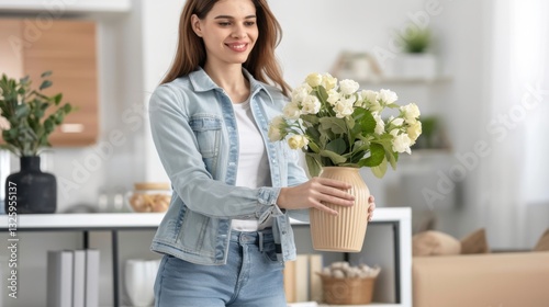 Young Woman Arranging Fresh Flowers in Modern Home Decor Settings with Light Colors and Sunshine