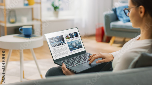 Young Woman at Home Is Using Laptop Computer for Scrolling and Reading News about Technological Breakthroughs. She's Sitting On a Couch in His Cozy Living Room. Over the Shoulder Shot