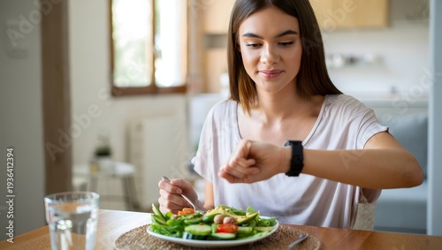 Young Woman Checking Smartwatch While Eating Healthy Salad at Home
