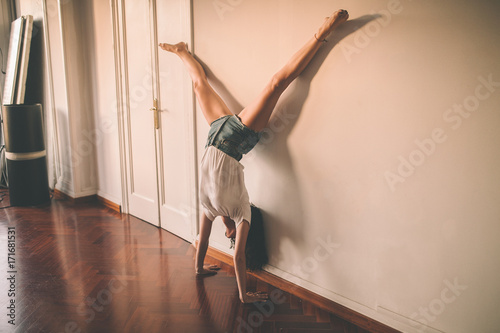 Young woman doing a headstand on a wall