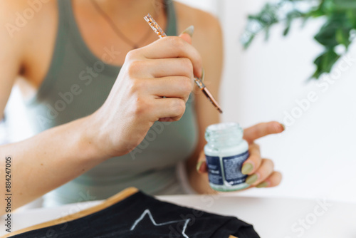 young woman draws picture on clothes with paints, handmade craft work. Customization
