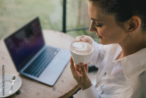 laptop, female, cup, cyberspace, hot drink, interior, caucasian, indoor, woman, computer, beautiful, using, young, technology, drink, notebook, happy, relaxation, morning, adult, people, casual attire, person, tea, business, happiness, successful, room, lifestyle, modern, web, working, online, wireless, sitting, device, smiling, relax, portrait, work, woman, table, smile, cafes, mug, network, remote, freelance, shopping