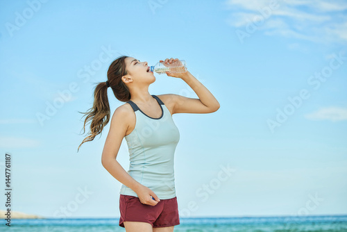 woman, drinking, water, sea, ocean, beach, exercise, fitness, sport, physical exercise, summer, vacation, holiday, travel, outdoors, nature, young, adult, female, tank top, short, bottle, refreshment, thirst, hydratation, healthy, lifestyle, casual attire, looking up, open mouth, relaxation, leisure, enjoyment, get-away, recreation, portrait, pose, sunlight, daylight, horizon, serene, peaceful, tranquil, well-being, health, activity, energy