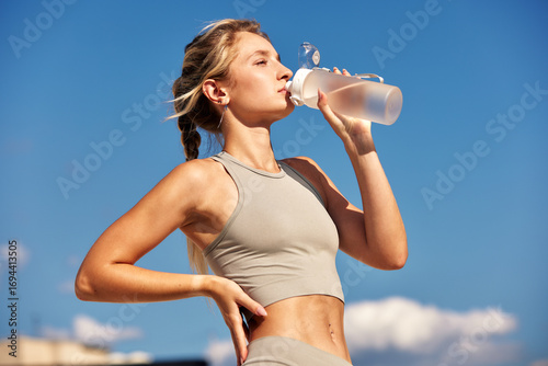 healthy lifestyle, drinking, water bottle, exercise, exercising, refreshment, vitality, day, morning, sunny, summer, outdoors, sky, blue background, well-being, bodycare, health, dehydration, young at heart, leisure, avocation, recreational pursuit, sport, athleticism, brightly lit, tracksuit, water, bottle, running, recreation, vibrant color, work out