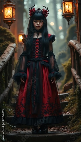 gothic, vampire, dress, forest, dark, woman, young, red, mysterious, hair, corset, timberland, antler, headpiece, mood, aesthetic, girl, japanese, fashion, model, beauty, elegant, style, people, person, children, black, costume, halloween, fantasy, horror, creepy, skittish, wood, path, lantern, fog, mist, night, nature, tree, decoration, cosplay, alternative, lolita, victorian, goth