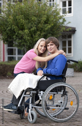 Young woman embracing her boyfriend sitting in wheelchair