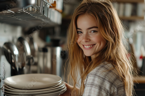 woman, kitchen, dish, smiling, happy, clean, home, domestic, lifestyle, housework, chore, organisation, modern, apartment, young, adult, 1, person, caucasian, looking, camera, portrait, real, people, candid, interior, day, plate, stack, holding, putting, away, tidy, life, household, cleaning, freshness, cheerful, carefree, beautiful, attractive, blond, hair, casual attire, shirt, counter, cabinet, appliance, dish