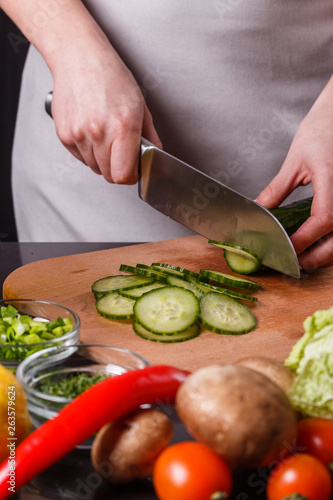 cutting, vegetable, woman, kitchen, knife, cooking, food, healthy, board, chopping, cut, female, vegetarian, fresh, tomatoes, table, closeup, salad, meal, wooden, home, view, cook, person, eating, hand, lifestyle, slice, young, diet, nourishment, organic, lunch, preparing, green, cucumber, chef, apron