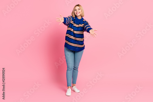 hug, invite, welcome, female, woman, girl, young, blond, hair, bob, pink, background, striped, sweater, pullover, jumper, stylish, trendy, casual attire, style, fashion, model, beautiful, attractive, charming, girlish, lovely, funny, happy, smile, leisure, lifestyle, gesture, signs, posing, joy, expression, shopping, advertising, promoting, confidence, open, arm, denim, jean, charme, positive, radiating, adorable, sale
