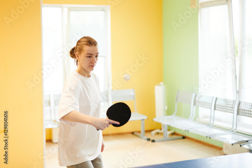 Young woman in a white T-shirt enjoys playing table tennis. Friendly compete in ping pong club