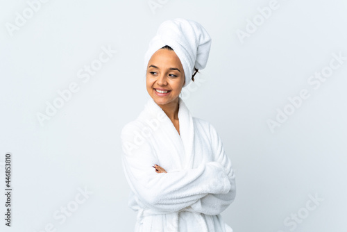 Young woman in bathrobe over isolated white background looking to the side and smiling
