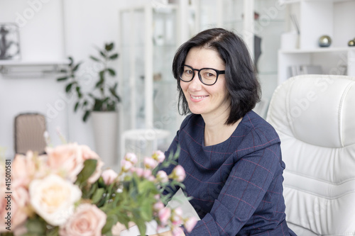 young woman in glasses and in blue dress works at home at laptop in bright interior, concept of congratulations on women's day, mother's day or congratulations to employees with bouquet of flowers