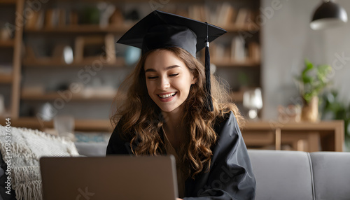 Young Woman in Graduation Cap Enjoying Online Learning Experience at Home with Laptop