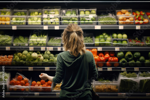 Young woman in grocery store. Girl choosing fruits and vegetables in food shop. Person buying food in grocery supermarket.