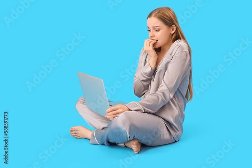 biting, blue, laptop, nail, pajama, woman, adult, afraid, background, beautiful, caucasian, colours, computer, confused, emotion, emotional, expression, female, freelance, girl, habit, job, lifestyle, nail, nervous, online, oops, panic, pensive, people, person, portrait, problem, puzzled, reaction, sad, sitting, stress, stressed, tension, thinking, thoughtful, trouble, unhappy, upset, website, work, worried, worrying