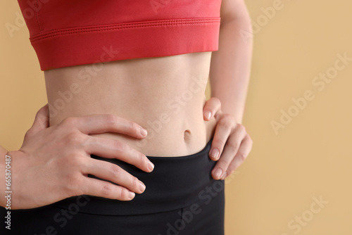Young woman in sportswear on beige background, closeup. Space for text