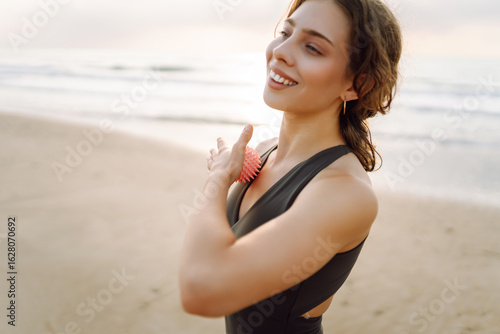 Young woman in sportswear working out her muscles with an mfr ball. Athletic woman exercising on the seashore, enjoying a sunny day. Stretching, relaxation concept. Active lifestyle.