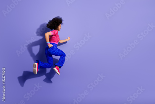 Young woman in vibrant outfit running against a bold purple background, showcasing energy, fashion, and modern casual style