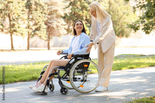 Young woman in wheelchair and her mother spending time together outdoors