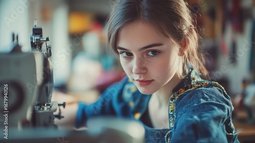 woman, girl, young, adult, female, person, face, eye, hair, brown, denim, jacket, shirt, sewing, machine, needle, thread, fabric, clothes, clothing, garment, fashion, design, craft, artisan, workshop, studio, indoor, room, light, sharpened, concentration, serious, expression, look, portrait, closeup, detail, pretty, beautiful, attractive, style, skill, talent, creation, maker, hand-made, artist, creative