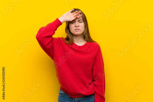 girl, woman, woman, people, person, lady, female, youth, young, caucasian, attractive, beauty, cool, pretty, beautiful, casual attire, background, yellow, wall, isolated, red, sweater, sleepy, portrait, sick, emotion, problem, ill, head, depression, lazy, expression, sad, stress, stressed, exhausted