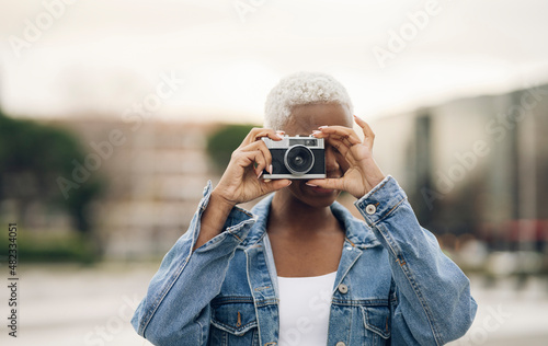 young, woman, photographing, old, camera, individuality, copy space, 1, people, travel, adult, journey, outdoors, day, spain, african, ethnicity, black, casual attire, denim, head shot, hobby, analog, photographer, photo, equipment, looking, obscured, face, old-fashioned, blond, holiday maker, tour tourism, city, holding, vacation, lifestyle, short hair, hair, device, peeling, jacket, female