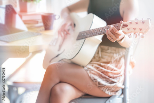 cropped, woman, leg, female, background, music, musical, entertainment, laptop, notebook, table, wooden, indoor, people, person, play, guitar, string, song, sing, adult, casual attire, caucasian, hobby, home, instrument, leisure, lifestyle, living, relax, sitting, chair, young, acoustic, guitarist, performance, hand, finger