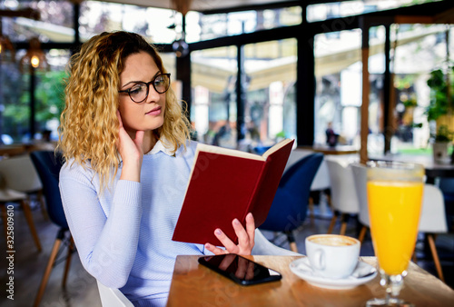 Young woman reading a book in the cafe. Education, lifestyle concept