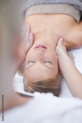 Young woman, relax and massage in spa for health, wellness and peace with hands for shoulder pain. Person, comfort or release of muscle tension by masseuse, body treatment or detox in resort for zen