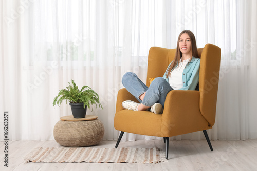 armchair, home, relaxing, window, woman, young, adult, apartment, background, beautiful, calm, carefree, caucasian, comfort, comfortable, comfy, cosy, enjoy, fashion, flat, floor, furniture, girl, happy, house, houseplant, indoor, interior, lazy, leisure, lifestyle, living, modern, orange, people, person, portrait, pouf, recreation, relax, relaxation, rest, room, rug, stylish, trend, weekend, white
