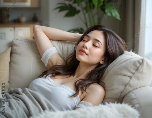 woman, relaxation, home, comfort, sofa, natural light, indoor, peaceful, happiness, leisure, calmness, lifestyle, serenity, casual attire, calm, beauty, asian, joyful, soft, cosy, rest, joy, skincare, female, warmth, fashion, home decor, wellness, authentic, candid, observing, elegance, daydreaming, portrait, gentle, contentment, sitting, quiet, comforting, closeup