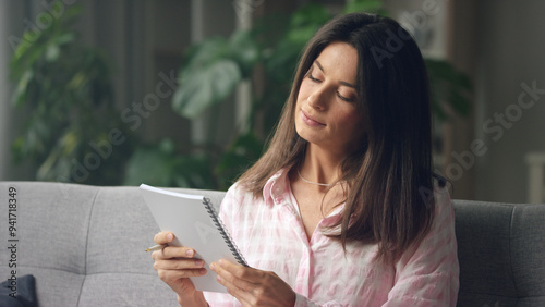 woman, book, reading, sofa, home, living, room, relaxing, comfortable, peace, quiet, leisure, lifestyle, enjoyment, happy, content, serene, tranquil, calm, peaceful, cosy, interior, house, apartment, window, natural, light, day, indoor, 1, person, adult, young, female, brunette, casual attire, shirt, pant, sitting, holding, looking, down