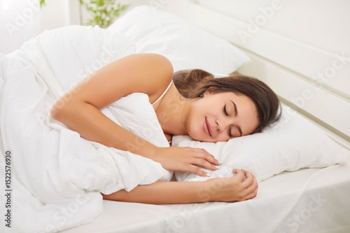 Young woman resting in bed with her eyes closed, enjoying peaceful morning in her bedroom at home. Relaxed Caucasian girl sleeping under white blanket, taking nap in sunlit bedroom during weekend.