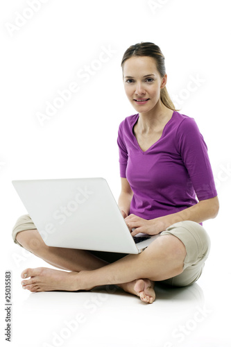 brunette, caucasian, woman, people, young, indoor, leisure, laptop, adult, adult, adults only, brown hair, one person, woman, young adult, young people, long hair, missy, casual attire, casual attire, sat, sitting, looking, barefoot beach, technology, computer, computer, information technology, cyberspace, communication, web, white background, cut-out, latina